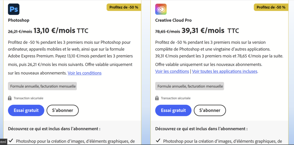 Sur cette capture d’écran, Photoshop seul est à 13,10€ TTC par mois avec une promotion de 50%, et la suite complète à 39,31€ TTC.